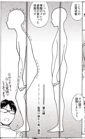 骨盤ゆがみ質問箱 歪みと姿勢2 ヨコヤマ 「では前回の続きです、 肩の高さに違いの出る骨盤の変位ですが。 左右の骨盤のズレの頻度によって 脚の長さや肩の高さに違いが出るんですね。 では図を見てみましょう 三人娘 「はーい」 ヨコヤマ書き文字で 「わかりやすいよう少し大げさにしてあります」 図を見ながら説明するヨコヤマ ヨコヤマ 「ズレの種類にもよりますが 骨盤のズレが大きい方の足が短くなり易く、 そのバランスを体が自動で補正をするので、 肩の高さに違いが出てくるのです。 負荷の出やすいところは図の通りですが、 互い違いに出ている事が分かって頂けると思います。」 月子 「骨盤のズレの左右差って結構出るものなんですか?」 ヨコヤマ 「ウチでの統計ですと揃ってズレている人より 左右差のある方が大勢いるんですよ」 美星 「先生じゃあ次は私が質問、 出産後の骨盤調整について教えて」 ヨコヤマ 「あ、それ良いテーマですね、 じゃあ来月は出産と骨盤についてお話ししましょう」 |